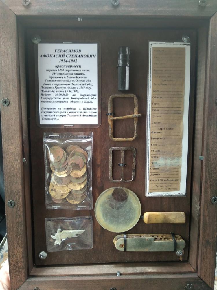 В музее Северо-Западного фронта состоялась передача тюменским поисковикам из отряда «Память сердца» останков и личных вещей красноармейца, стрелка 1274 стрелкового полка 384 стрелковой дивизии Герасимова Афонасия Степановича, найденного осенью, для перезахоронения на малой родине.