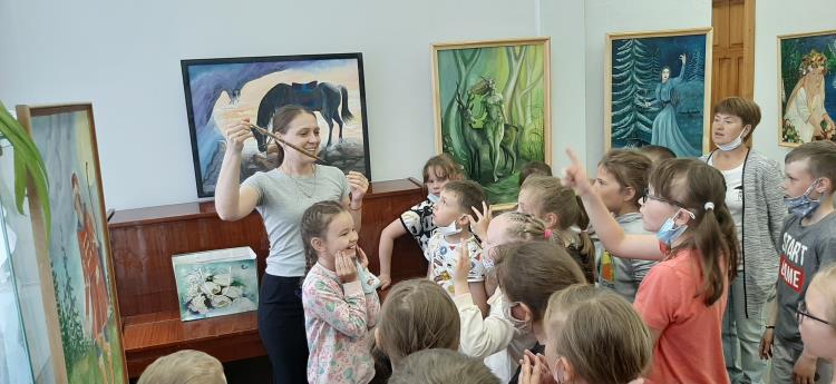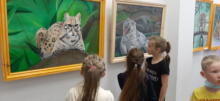 Знакомство с картинами четвертого зала начинается с загадок: школьники узнают зверей по следам и голосам.