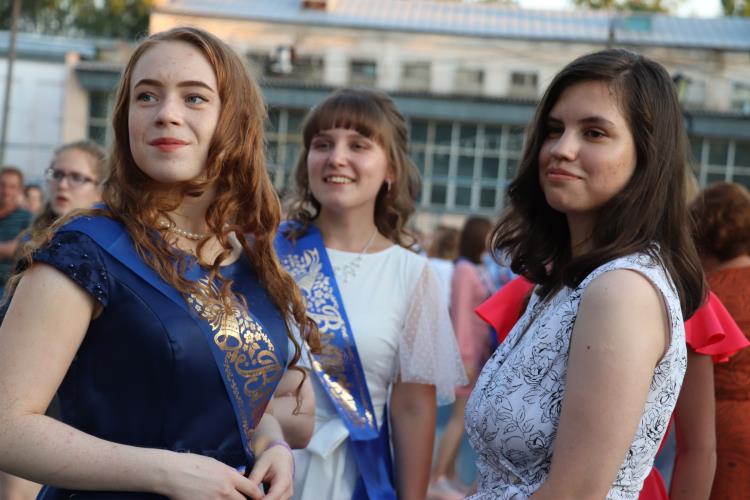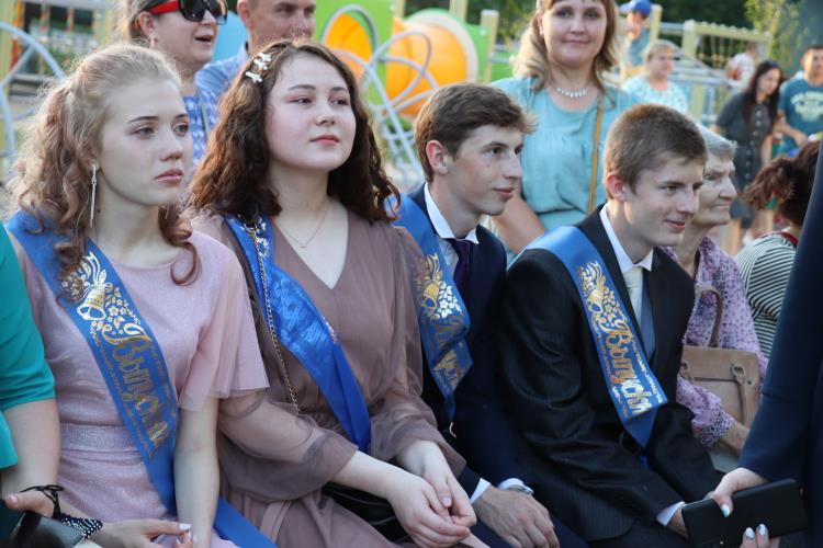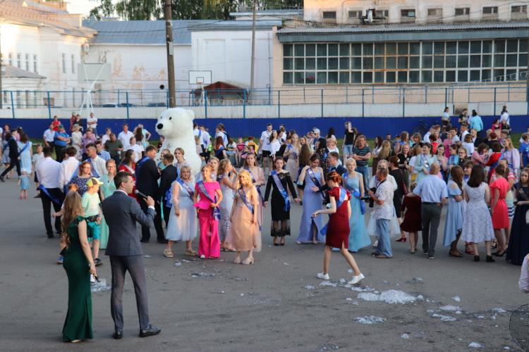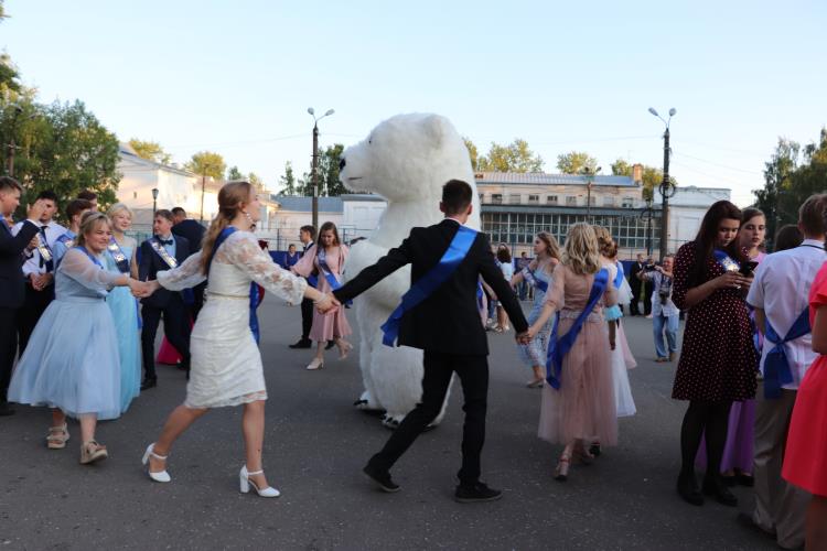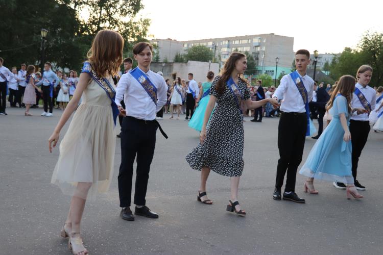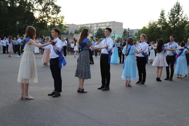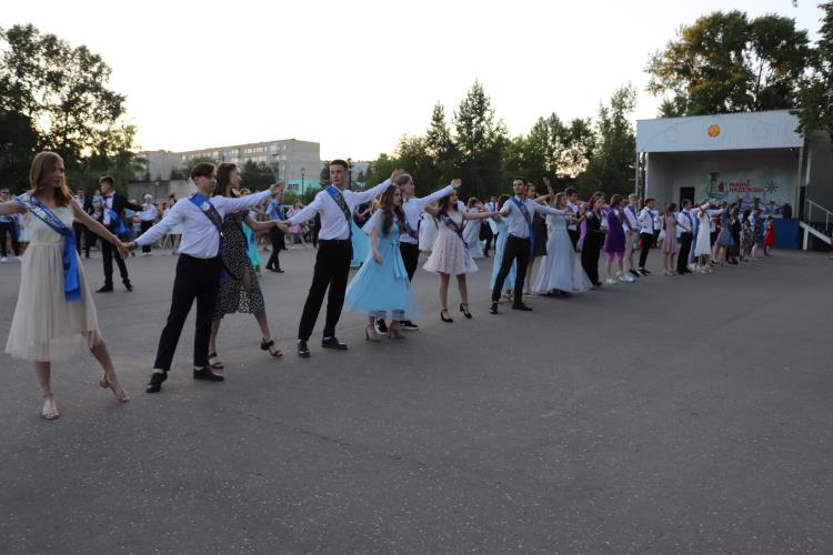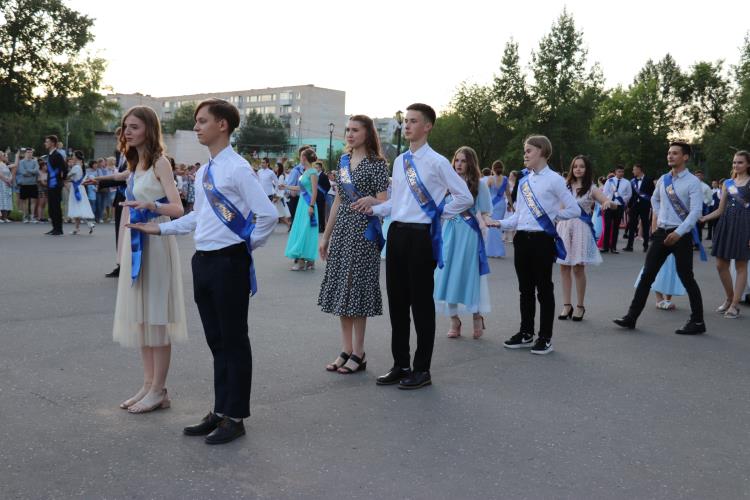 Более 150 выпускников - главных героев мероприятия - исполнили общий школьный вальс в парке ДК, после чего праздник продолжился в зрительном зале.