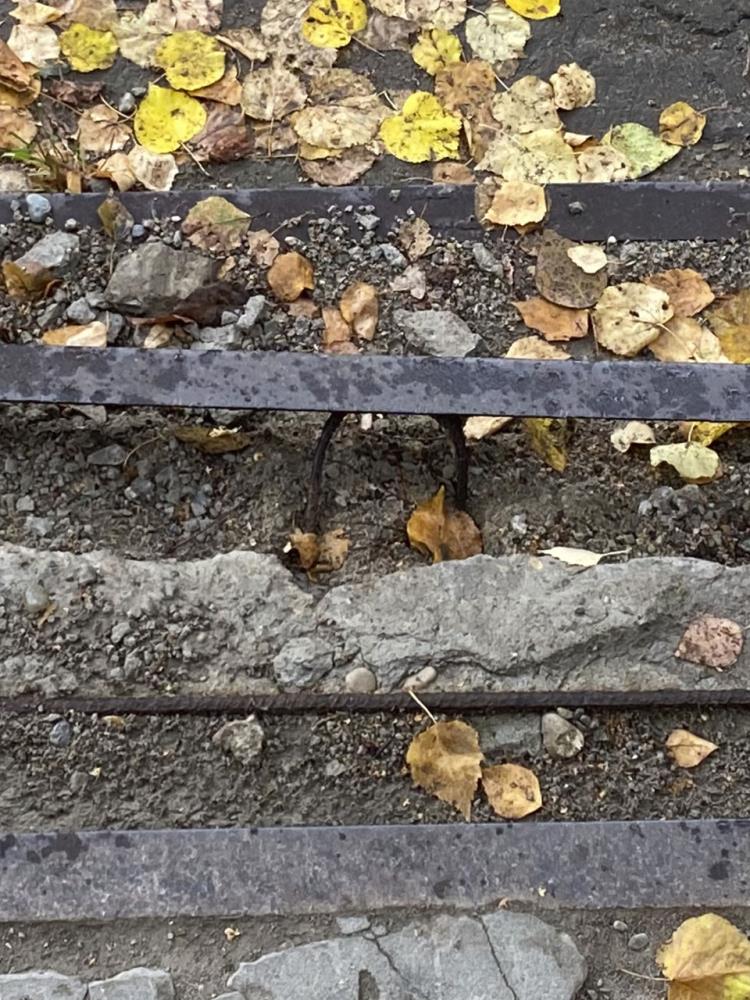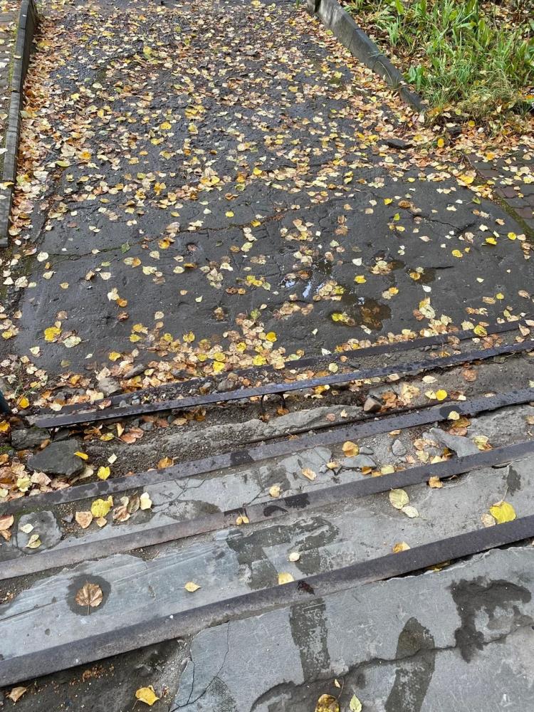Характер его повреждений весьма серьезный: нижние ступени полностью разрушены, на верхних – трещины и выбоины. Бетонная лестница крошится, а металлическая отделка по кромке конструкции предательски отходит в сторону.