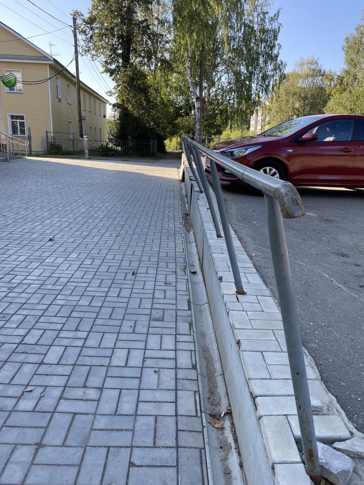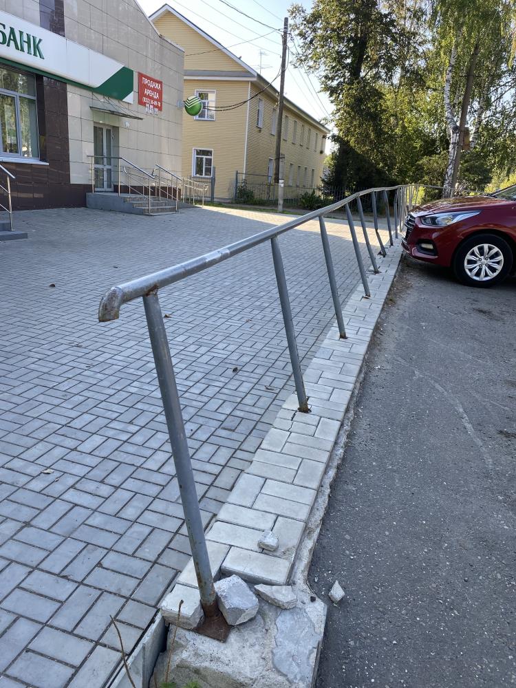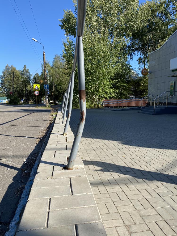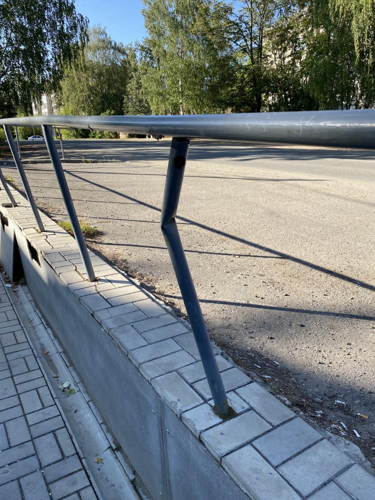 Оно сильно искорежено, одна из трубок металлической конструкции отломлена, окрашенное покрытие имеет царапины, сколы и следы ржавчины, плитка трескается, кирпичи отваливаются. Обшивка со стороны пешеходной зоны наполовину рухнула и очутилась в водостоке.