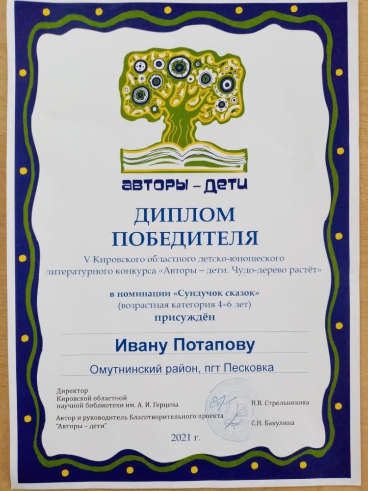 Сказка «Приключения капельки Таси» Ивана Потапова из Песковки вошла в «Сборник произведений победителей» V Кировского областного детско-юношеского литературного конкурса «Авторы – дети. Чудо-дерево растёт».