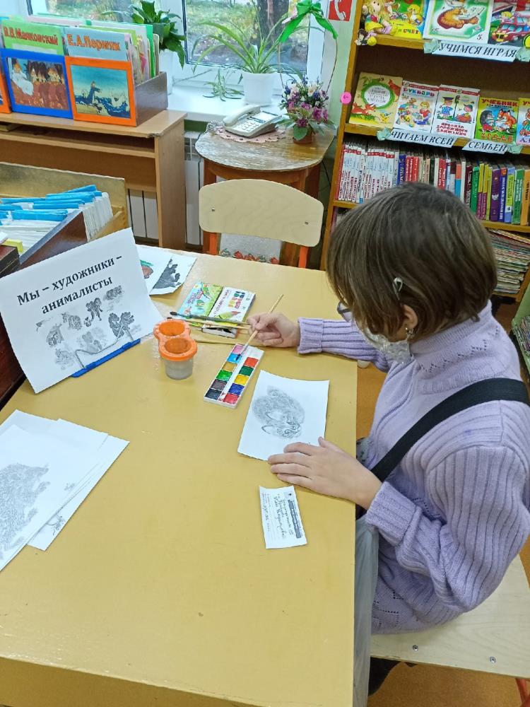 После беседы у выставки дети ответили на вопросы викторины о творчестве писателя и попробовали себя в роли художника-анималиста.