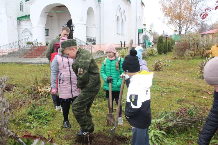 Участники акции, а это курсанты ПВПК им. Святого Георгия Победоносца, а также воспитанники детской воскресной школы и их родители, вооружившись лопатами и ведрами, все вместе совершили доброе дело: по благословению иерея Евгения Сафронова 7 саженцев нашли своё место на территории Свято-Троицкого собора, ещё 7 кедров разместились на прилегающей к духовно-просветительскому центру территории. Руководил посадкой А.А. Русских.