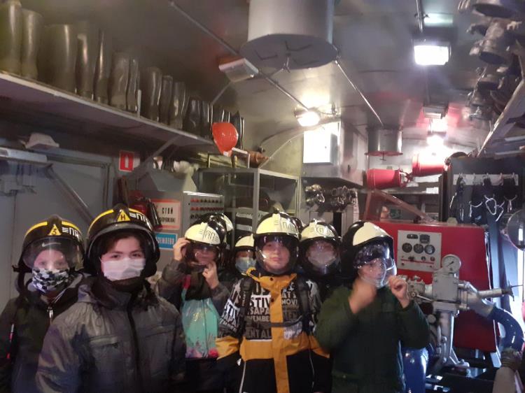 Ребята увидели обмундирование пожарных, дыхательные аппараты сжатого воздуха для работы в задымленных помещениях, мотопомпы для подачи воды в рукава, электростанцию для подачи электроэнергии при выезде на пожар, примерили бойцовские каски.