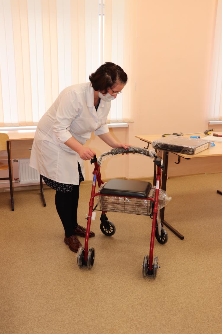 Среди приобретенного оборудования – ортопедическая подушка; доска, позволяющая перемещать тяжелобольного пациента с кровати на кресло-каталку; регулируемая трость, активный захват для пациентов, перенесших инсульт; приспособление для легкого надевания носок для маломобильных граждан; гигрометр, измеряющий влажность и температуру воздуха в помещении; опоры-ходунки, облегчающие передвижения людей с нарушениями опорно-двигательного аппарата и координации движения.
