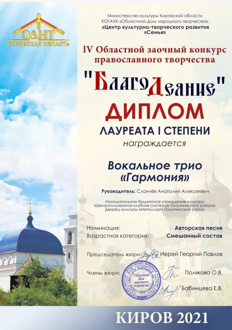 Дворец культуры «Металлург» представило вокальное трио «Гармония» под руководством Анатолия Сланчева. Коллектив стал лауреатом I степени в номинации «Авторская песня».