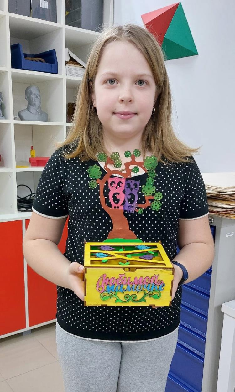 Вместе с наставником Василием Мечёвым ребята изготовили дерево для украшений и бижутерии и шкатулку для мелочей «Любимой мамочке». Все элементы были смоделированы в программе CorelDraw и вырезаны с помощью лазерного гравера.