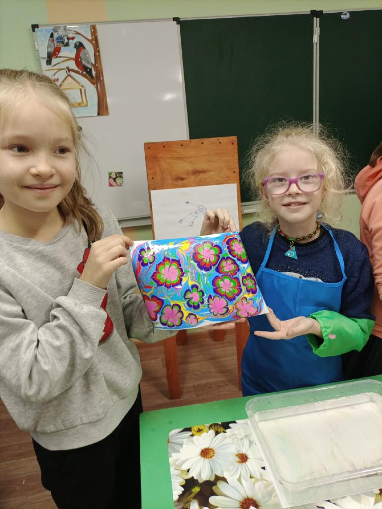 Юные художники объединения «Изостудия «Шедевр» Дома детского творчества создают неповторимые рисунки на воде.