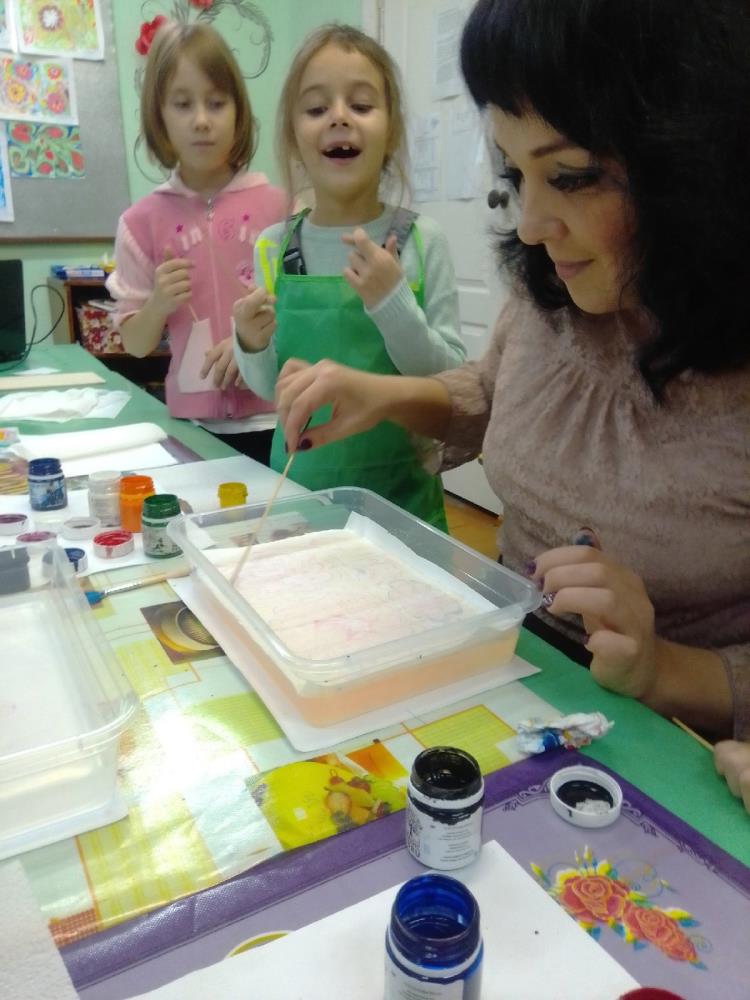 Этот метод рисования называется эбру и предполагает использование в качестве холста воды. В результате получаются невероятные по своей красоте рисунки, повторить которые невозможно. Поверхностью для нанесения узора служит жидкость, которую готовят специальным способом. Для рисования используются краски на натуральной основе. Цвета чудесным образом перетекают из одного в другой, образуя сказочные узоры. Рисование в этой технике вызывает у воспитанников студии восторг, радость и желание творить. Примечательно то, что орнамент с воды ребята потом переносят на бумагу, прикладывая ее к поверхности, сушат и в дальнейшем используют для создания аппликаций.