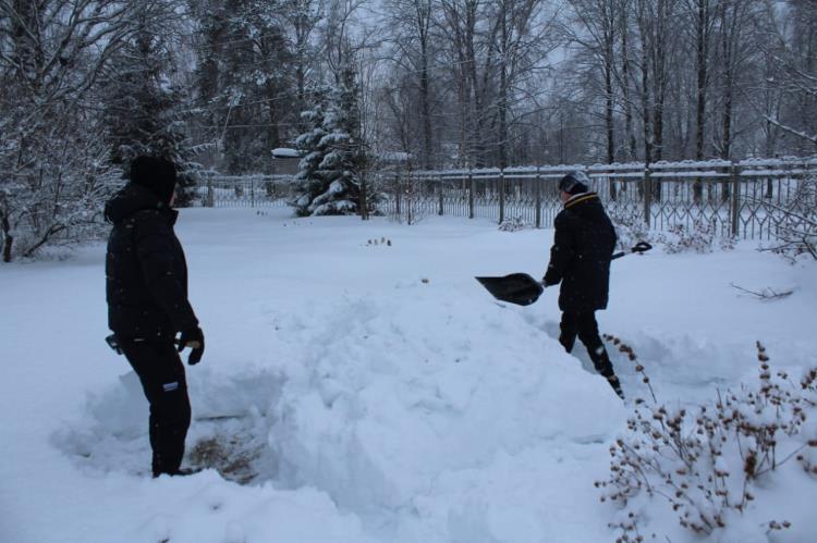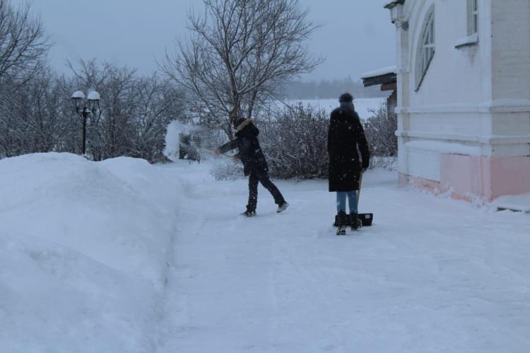 Курсанты православного военно-патриотического клуба имени Святого Георгия Победоносца во главе командира Сергея Кощеева вышли на трудовой десант - очистить от снега дорожки Свято-Троицкого собора Омутнинска.