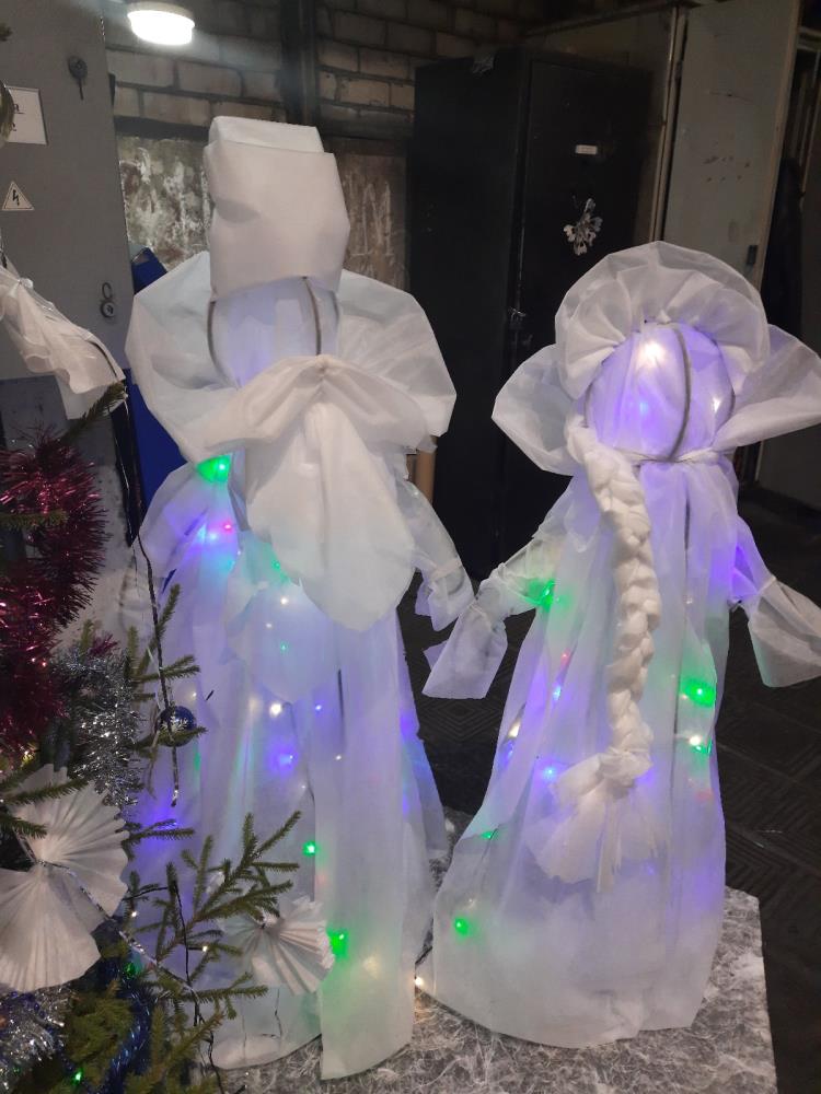 В этом году главные герои праздника - Дед Мороз, Снегурочка и Снеговик - сделаны из металлического каркаса. Фигуры обтянуты светодиодной лентой и белой тканью.