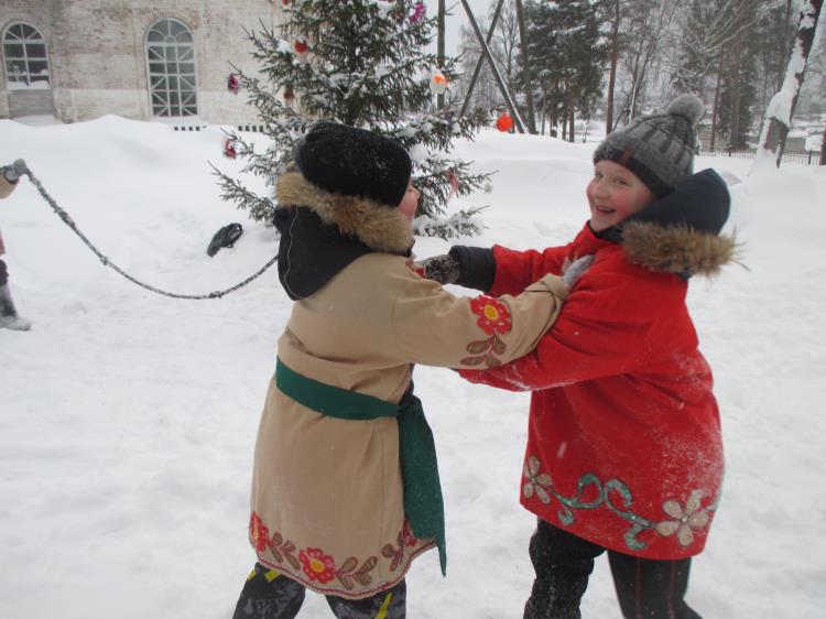 На свежем воздухе состоялась фольклорная программа, в рамках которой участники перетягивали канат, в снежных крепостях играли в рыцарей, соревновались в метании снежков.