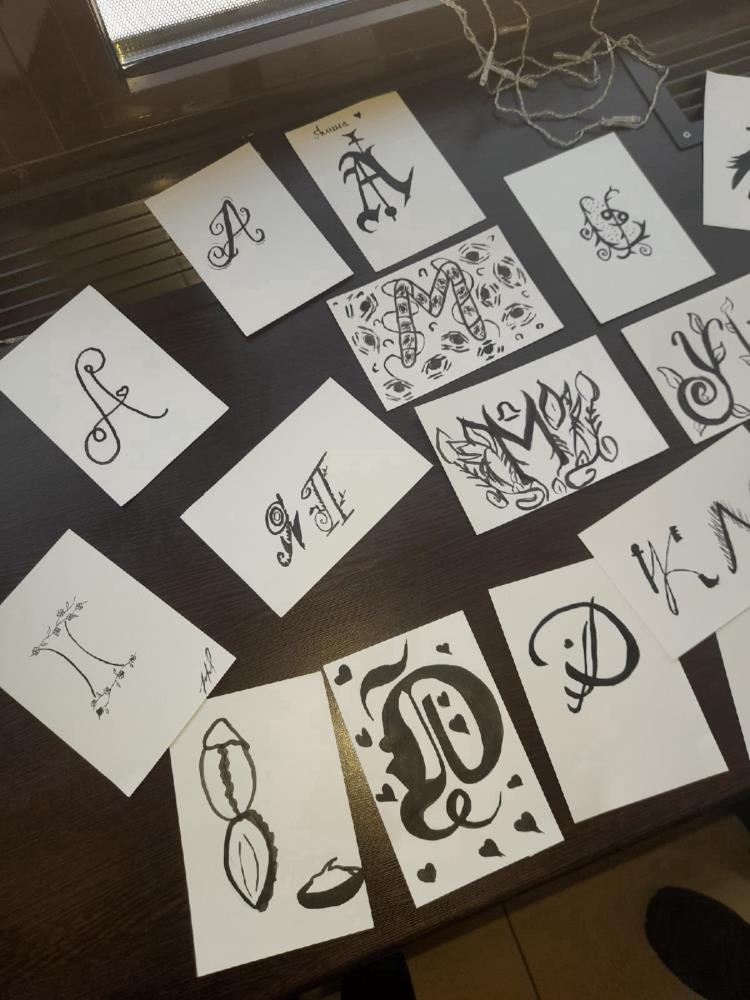 Ребята стилизовали первую букву своего имени, совмещая её с характером, значением имени или любимым увлечением. Когда участники проработали идею, начали заливать тушью и выводить линии. Ребята развивали фантазию, равновесие, эстетику.
