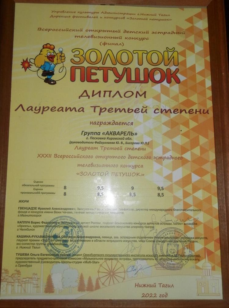 С 31 марта по 3 апреля в Нижнем Тагиле проходил всероссийский открытый детский эстрадный телевизионный конкурс «Золотой петушок», и в нем принял участие ансамбль «Акварель» Песковской ДШИ.