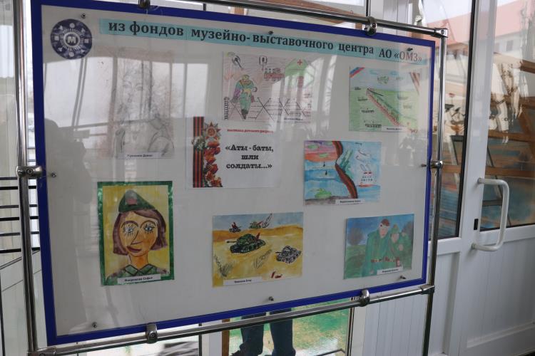 В преддверии 77-летия Великой Победы специалисты музейно-выставочного центра градообразующего предприятия организовали на проходной завода выставку детского рисунка «Аты-баты, шли солдаты».