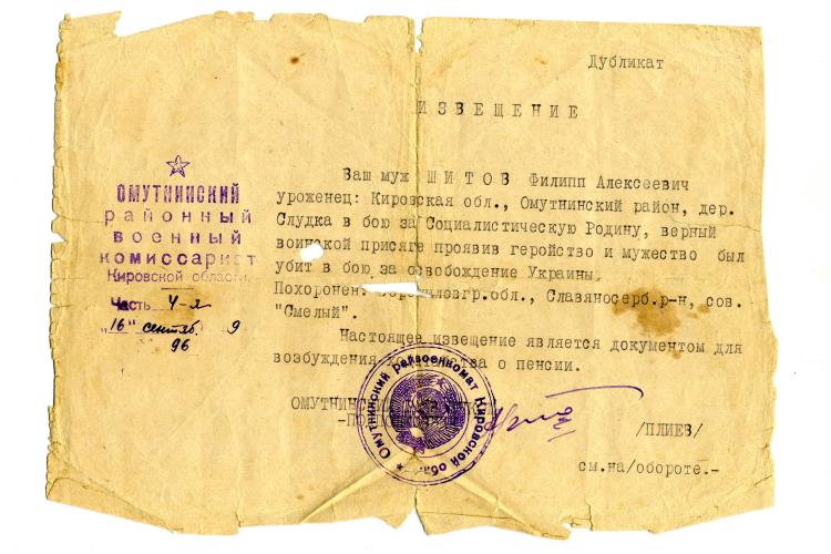 – В годы войны сельчане боялись почтальона. Как только он появлялся на улицах, все с замиранием сердца смотрели, в какой дом он зайдет, потому что часто приходили похоронки. И сколько боли принесла родным тяжкая весть, которую принес почтальон. «Ваш муж Шитов Филипп Алексеевич уроженец: Кировская область, Омутнинский район, деревня Слудка в бою за Социалистическую Родину, верный воинской присяге проявив геройство и мужество был убит в бою за освобождение Украины. Похоронен: Ворошиловградская область, Славяносербский район, совхоз «Смелый».