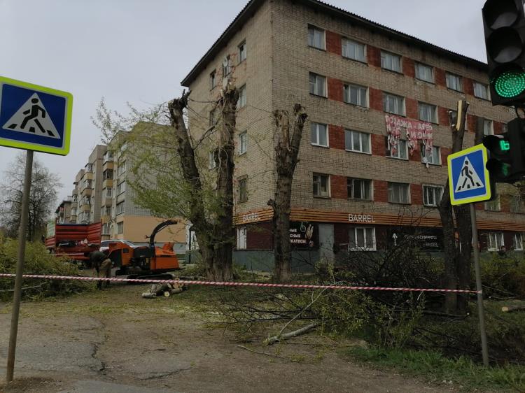 По улице Коковихина в рамках проекта «Народный бюджет» специалисты кировской организации убирают деревья.