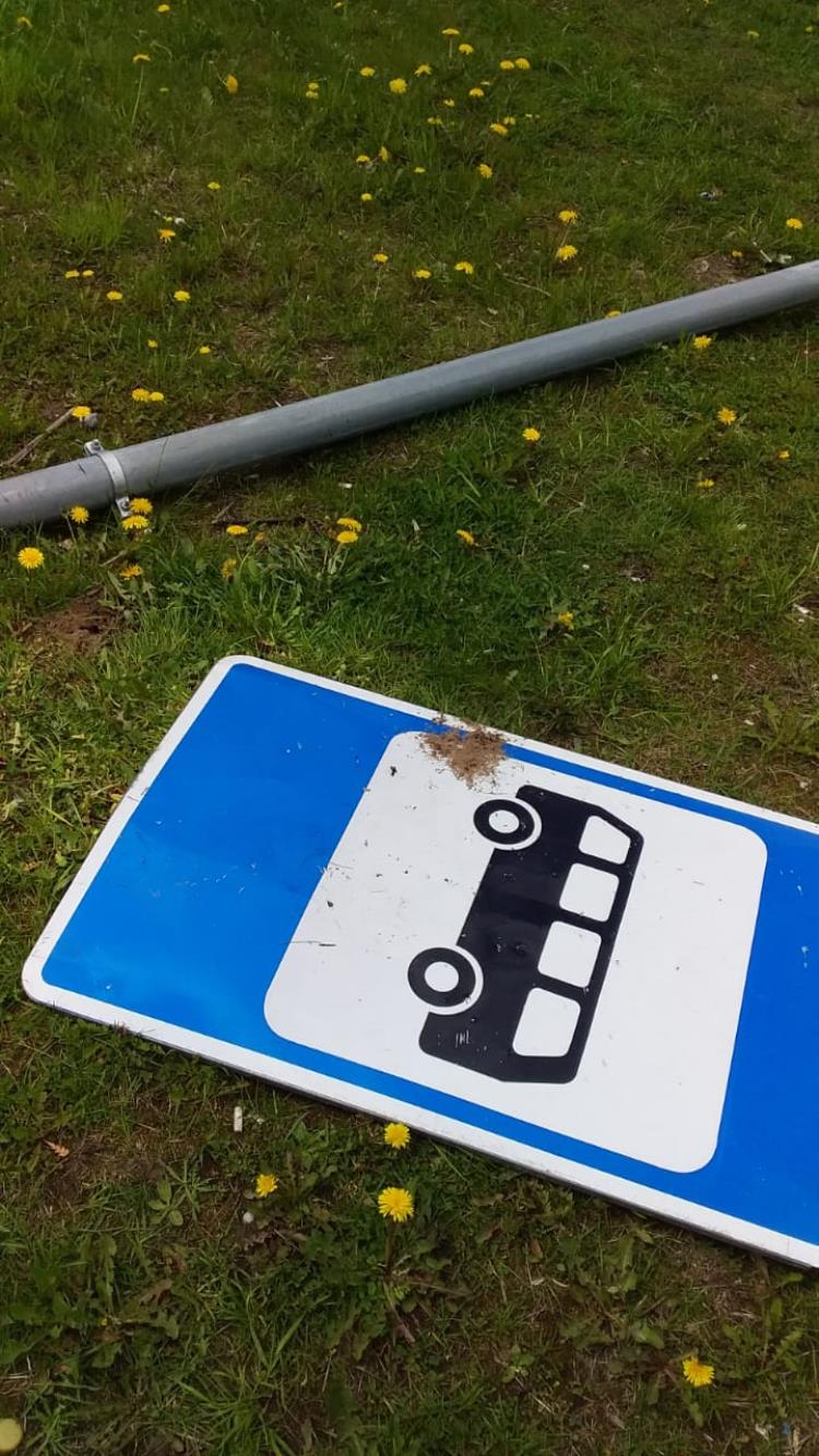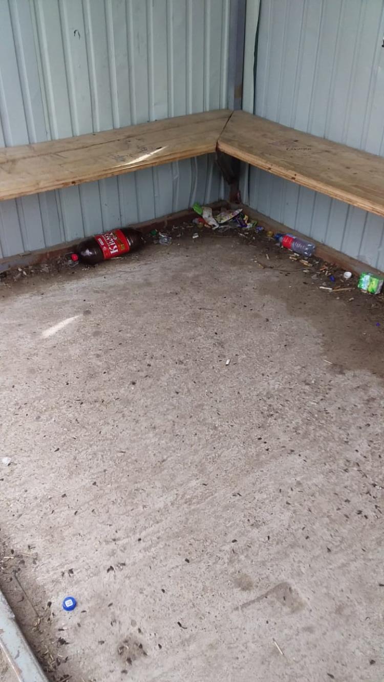 Некогда чистую и ухоженную остановку на улице Кирова просто не узнать! Под скамьями навален мусор: пустые бутылки и упаковки из-под сока, фантики и окурки, а дорожный знак сломан и повален на землю.