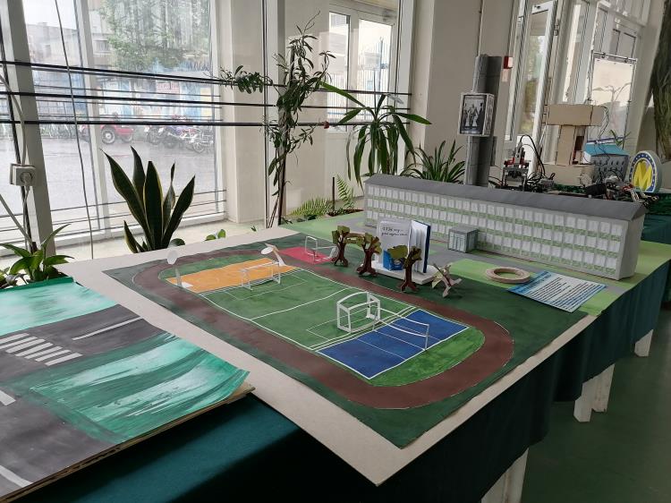 На выставке, оформленной на проходной градообразующего предприятия, представлены дизайны фасадов зданий структурных подразделений, макет обновленной территории государственной школы Омутнинска, роботы и проект цифровизации гидравлического пресса.