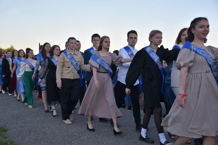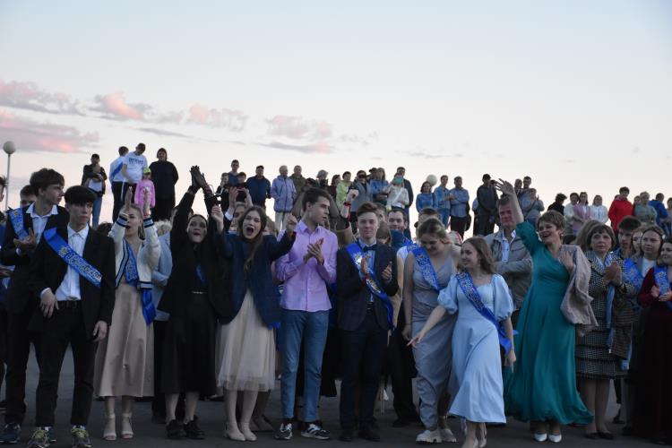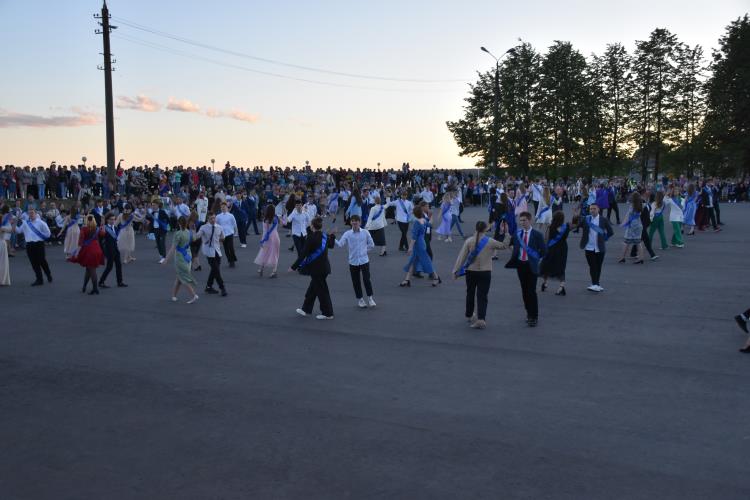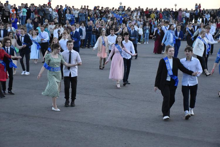 Одним из трогательных моментов вечера стал прощальный школьный вальс, в котором на набережной пруда закружились 135 молодых людей.