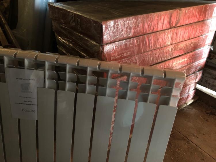 Приборы отопления уже закуплены. Но перед их установкой необходимо обшить стены гипсокартоном. После будет проведена проектная установка радиаторов. Также предстоит закупить трубы, фланцы, сногы, краны, переходники. Уже после этого начнут монтировать систему отопления.