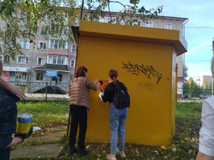 Добровольцы закрасили более 30 надписей на фасадах зданий, остановочных павильонах, рекламных щитах.