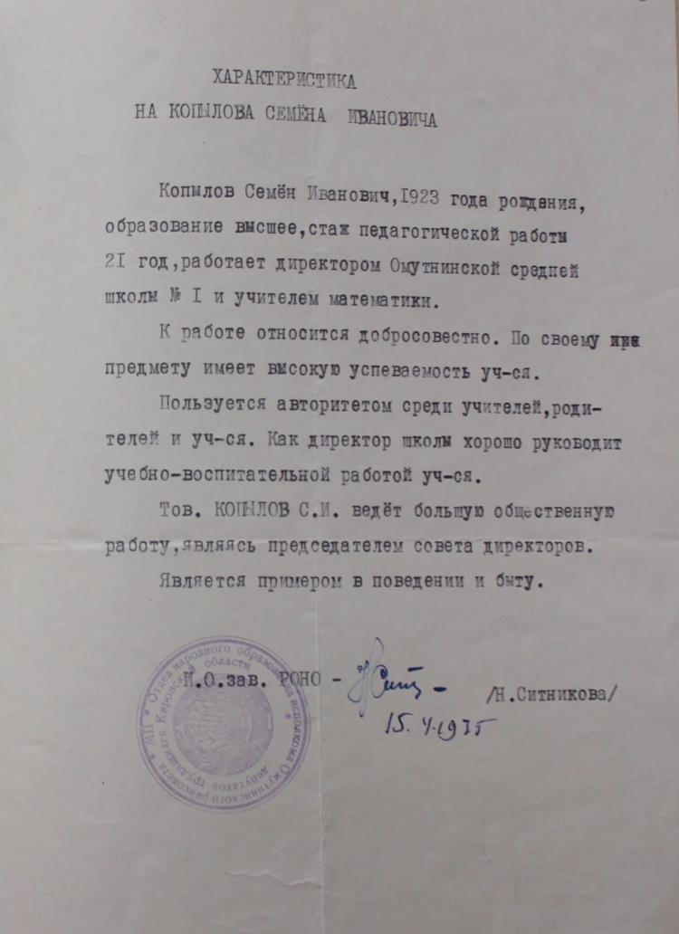 Копылов Семен Иванович — добрый учитель, справедливый директор школы, уважаемый человек в городе. Старшее поколение хорошо помнит его слегка хромающую походку — последствия ранения и контузии, полученных на фронте.