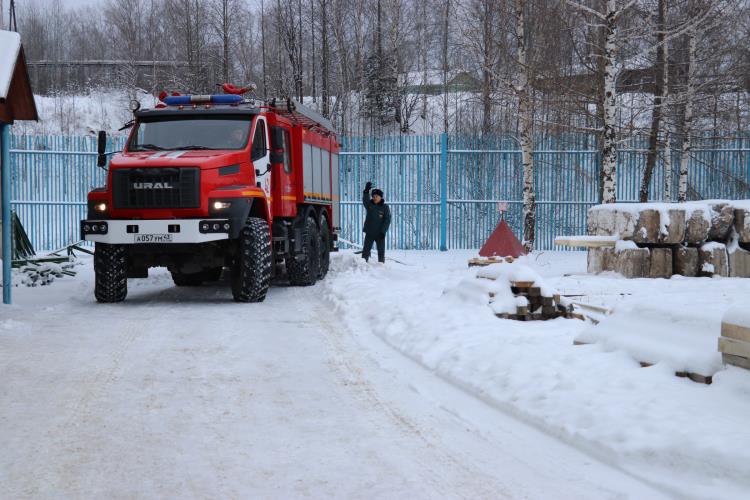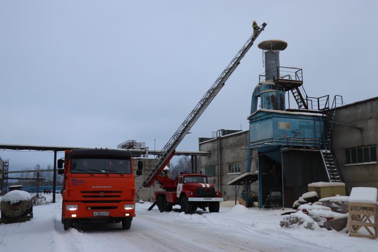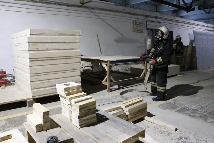 По тактическому замыслу учений произошло возгорание пиломатериала, сильное задымление и угроза возгорания соседних зданий.