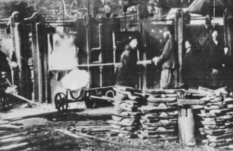 Мы заходим сперва под домны. Если мы зайдем около 11 часов дня или 5-6 вечера, то смотрим выпуск чугуна, происходящий четыре раза в сутки. Это очень красивое зрелище. Рабочий пробивает ломом замазанное глиной отверстие в жерле печи. Оттуда медленно вытекает ослепительно-белый металл. Глазам трудно смотреть на исходящий от него свет. Картина любопытная, но непривычному человеку здесь долго не пробыть.