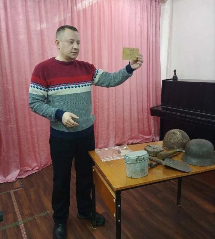 Большое содействие в проведении таких мероприятий оказывает Алексей Русских, руководитель военно-патриотического клуба на базе духовно-просветительского центра Омутнинска, который принимает активное участие в поисковой деятельности. Он представил экспонаты, найденные во время поисковых работ и рассказал о деятельности поискового отряда.