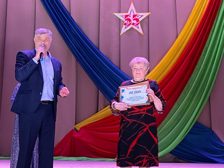 От имени генерального директора АО «ОМЗ» С.А. Волоскова руководителю ДК Светлане Мамаевой вручили поздравительный адрес и сертификат на двадцать тысяч рублей.