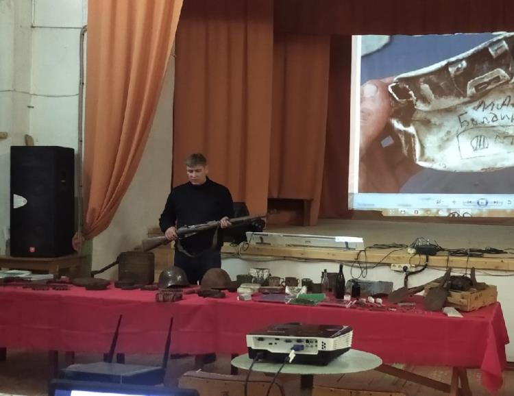 Дополнением стала выставка найденных отрядом вещей. Участники мероприятия внимательно слушали Евгения Олеговича, задавали вопросы, с интересом разглядывали представленные экспонаты и фото. Три экспоната подарены музею при Доме культуры поселка.