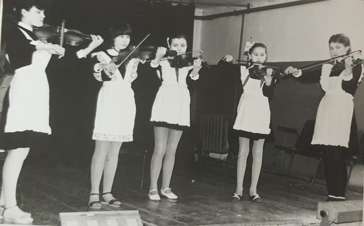 В 1975-ом открывается класс скрипки, преподаватель Марина Ивановна Иващенко. Позднее в классе начала преподавать Надежда Михайловна Колесникова, которая проработала в школе более сорока лет и воспитала не одно поколение юных скрипачей. А какой слаженный и крепкий был у нее ансамбль скрипачей, единственный в районе, победитель областных и межрайонных конкурсов, любимец публики!
