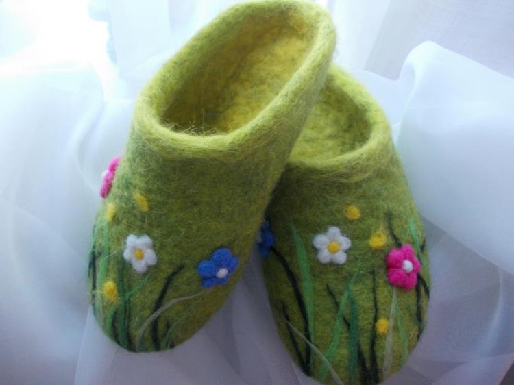 Для работы необходимы шерсть, теплая вода, мыло и руки, которые сухую шерсть заданного цвета раскладывают на столе, покрытом пупырчатой пленкой. Сверху делаю рисунок из цветной шерсти, накрываю москитной сеткой или редким тюлем. Затем смачиваю мыльным раствором и начинаю тереть руками в разных направлениях до тех пор, пока отдельные пряди хорошо не сцепятся между собой и не будут отрываться. Смываю мыло теплой водой, слегка отжимаю и сушу. К примеру, на изготовление тапочек у меня уходит часа полтора-два.