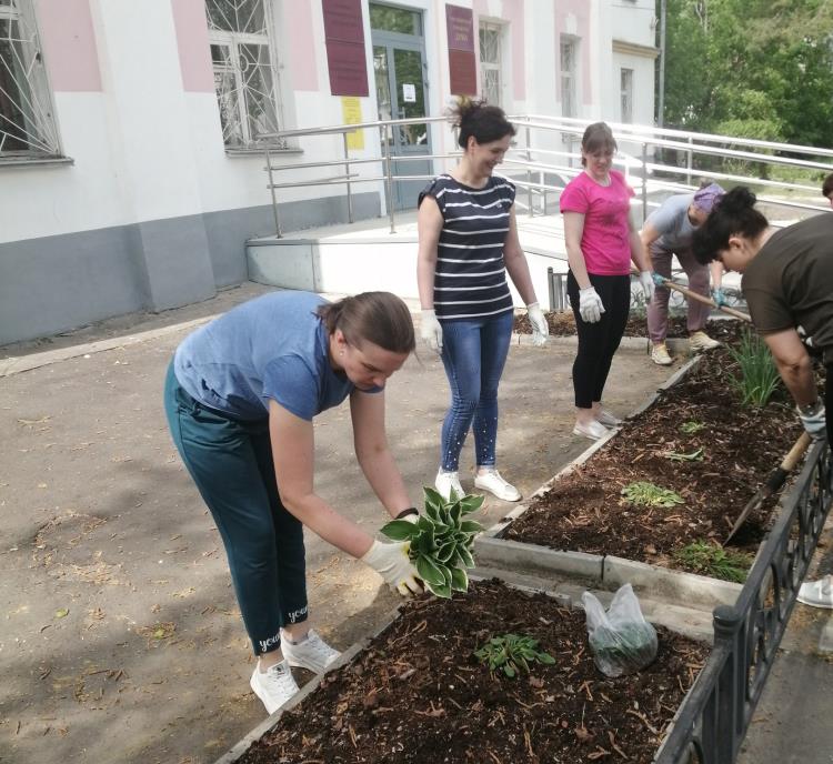 Сотрудниками администрации района и города высажены туи и можжевельник, а также цветы на территории, прилегающей к зданию администрации.