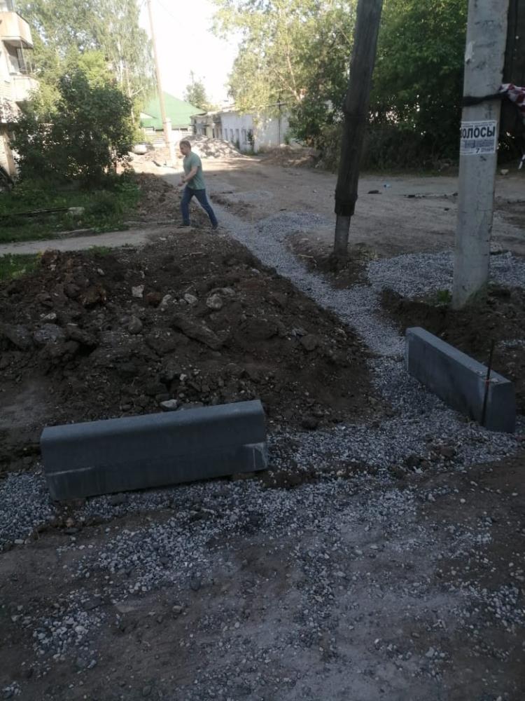Демонтировано старое покрытие, завозятся строительные материалы, устанавливается бордюрный камень.