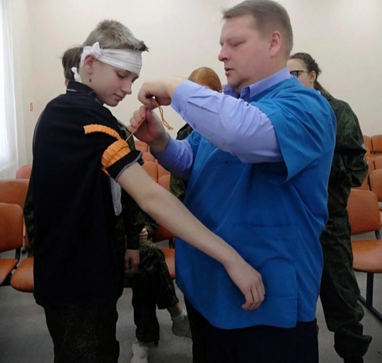 О первой медицинской помощи в военно-полевых условиях подросткам рассказали самый опытный в Омутнинском районе фельдшер медицинской скорой помощи высшей категории Павел Змеев и медицинская хирургическая сестра высшей категории Омутнинской ЦРБ Елена Питель.