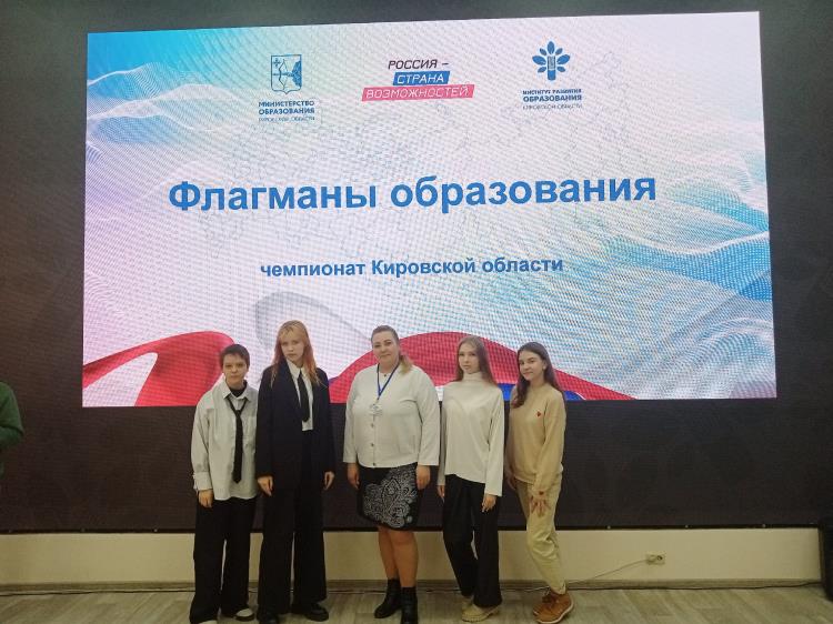 Студенты Омутнинского колледжа педагогики, экономики и права Дарья Рычкова, Анна Городилова, Алина Никифорова, Анастасия Журавлева и советник директора по воспитанию Анастасия Лапина приняли участие в региональном чемпионате «Флагманы образования».