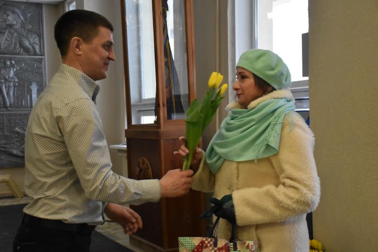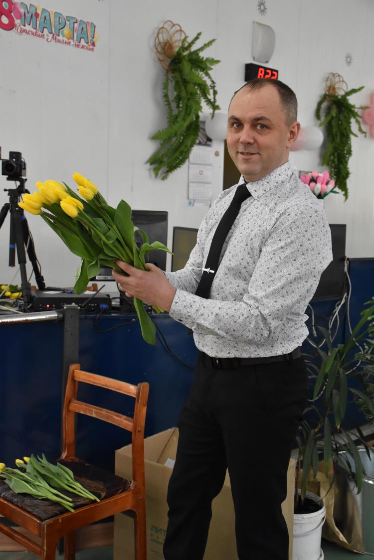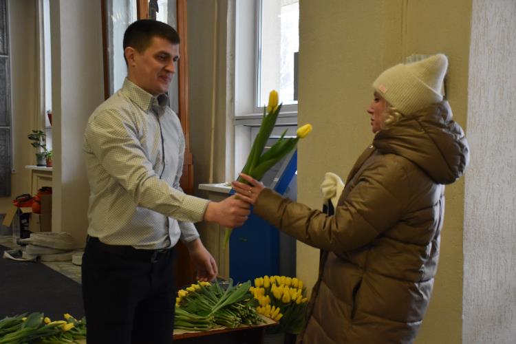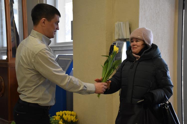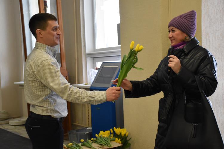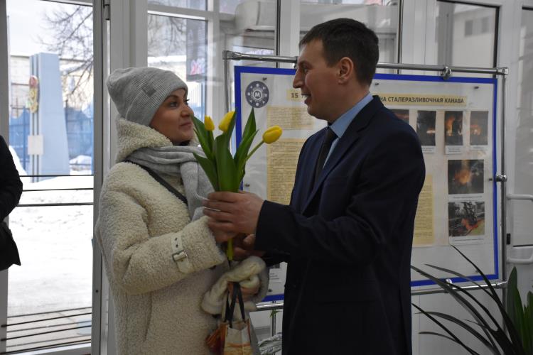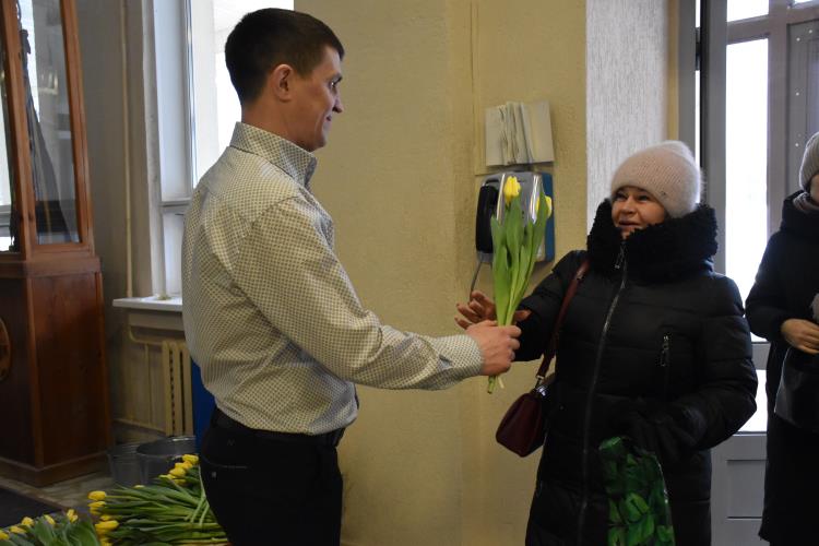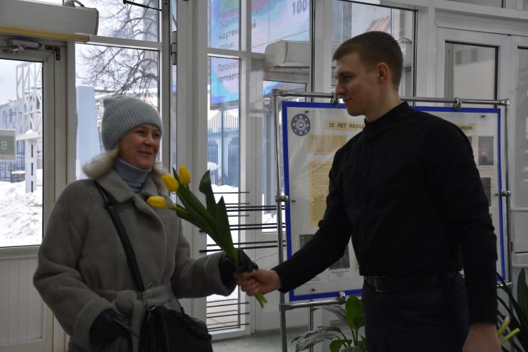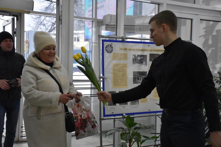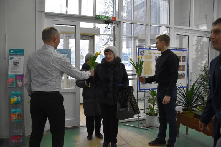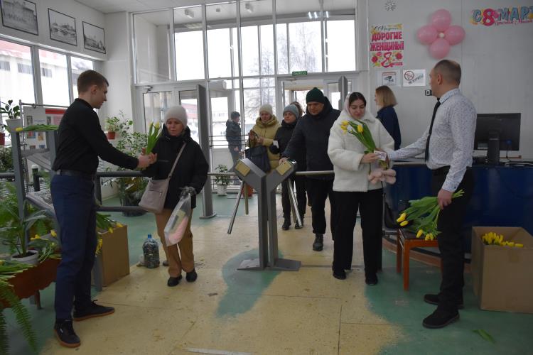 По традиции на проходной завода организовано поздравление и вручение букета тюльпанов каждой заводчанке.
