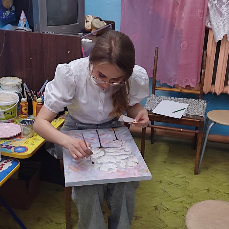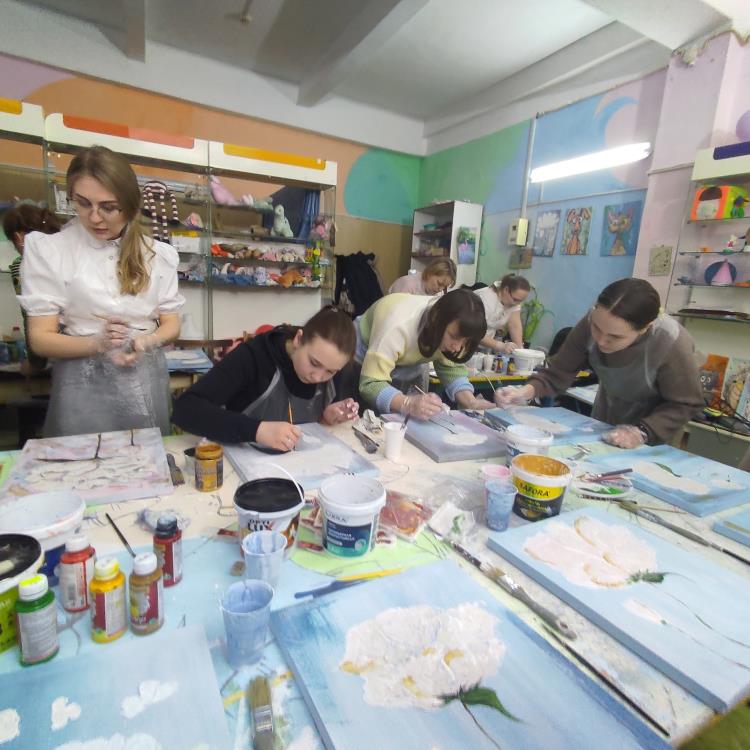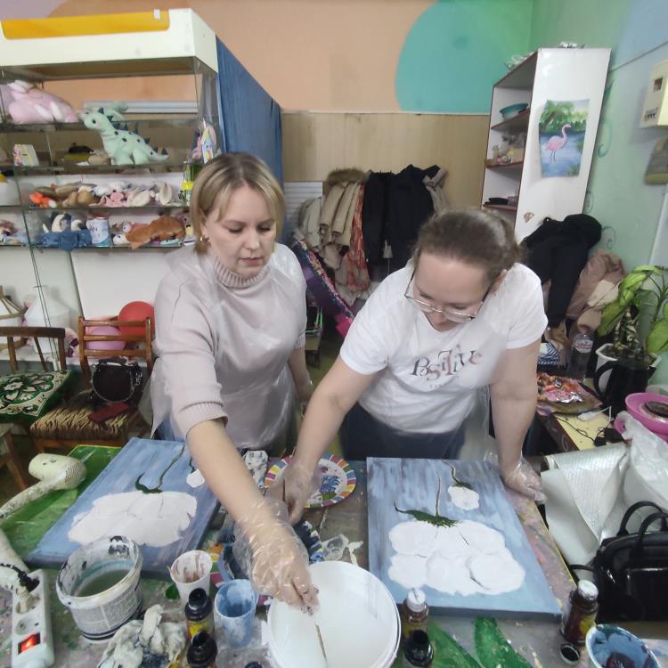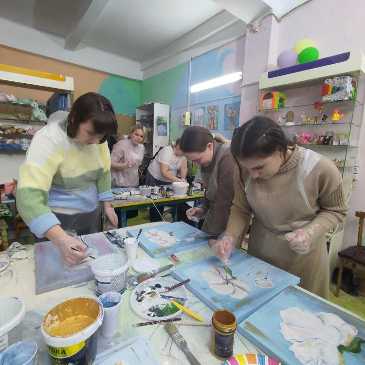 Елена Эдуардовна учила наносить на холст акриловый грунт, исполнять цветы мастихином и кистью, добиваться фактурности и рельефной поверхности, придавать определенные оттенки и светотени, достигать интересных эффектов.