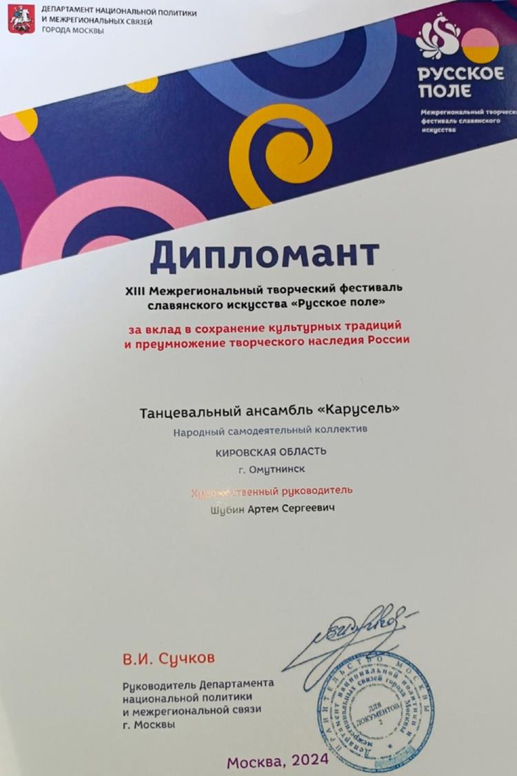 В музее-заповеднике «Коломенское», г. Москва, состоялся XIII межрегиональный творческий фестиваль славянского искусства «Русское поле». Участником события стал танцевальный ансамбль «Карусель», руководитель Артем Шубин.