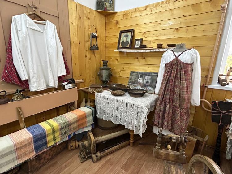 В экспозиции «Русский быт» представлены посуда, одежда и орудия труда конца XIX - начала XX века, монеты, народное творчество. Здесь же оформлен уголок комнаты середины прошлого столетия, который вызывает особый интерес у юных посетителей, так как многие вещи ребята видят впервые.