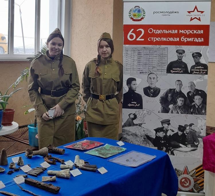 Молодые люди – Григорий Балыбердин, Роман Котегов, Анастасия Подгорбунская, Алина Лусникова – провели экскурсию по экспозиции, посвященной 62-й отдельной морской стрелковой бригаде. Евгений Олегович, как активный участник поискового отряда «Факел», от первого лица поделился ценной информацией о деятельности поисковых отрядов. Рассказал интересные истории о судьбах погибших воинов, память о которых хранится в находках и экспонатах музея колледжа педагогики, экономики и права.