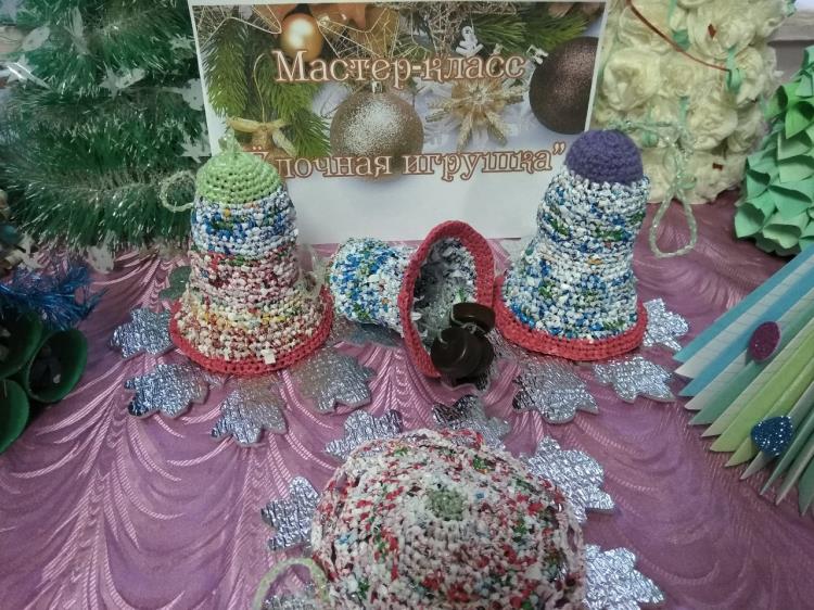Кроме этого, жительницы Шахровки делают новогодние игрушки. Галина Ившина связала колокольчики из молочных пакетов.
