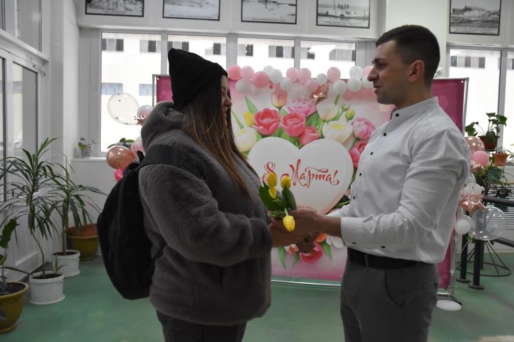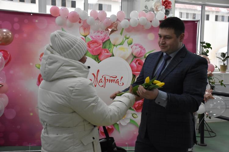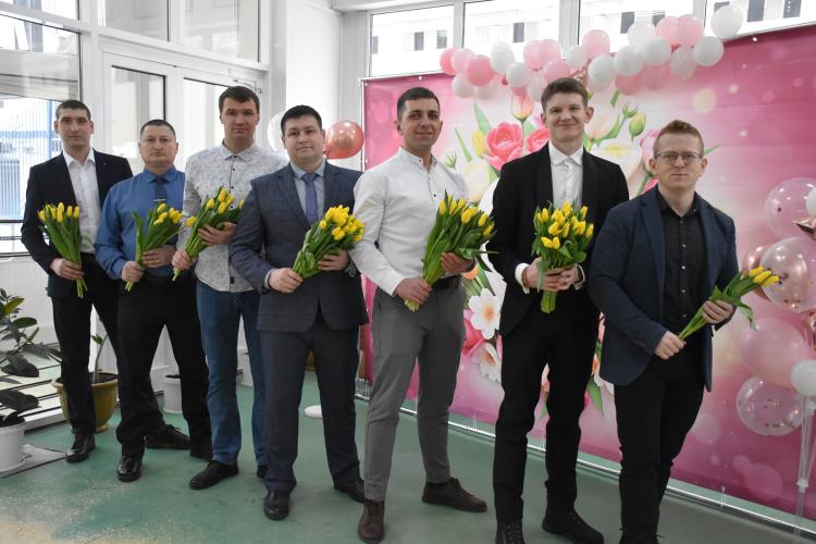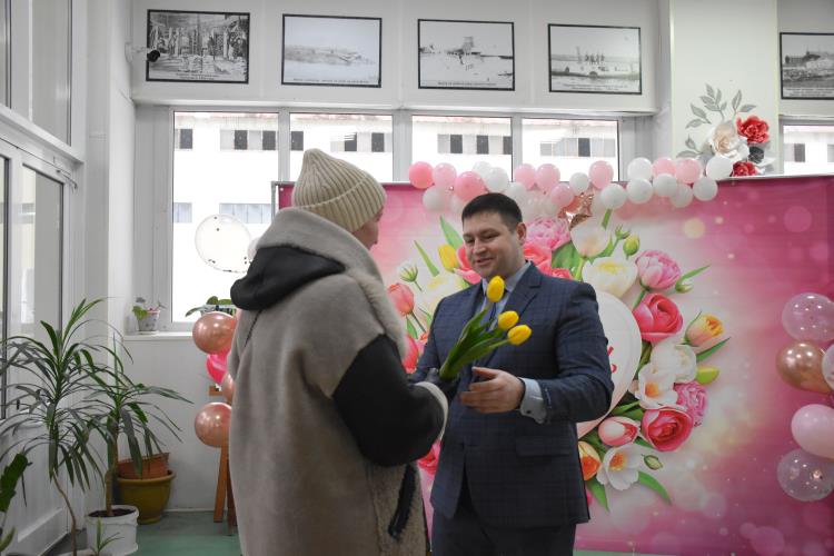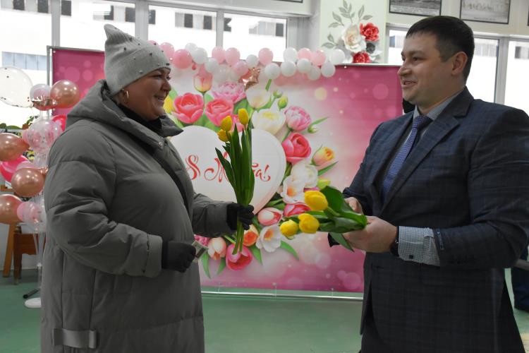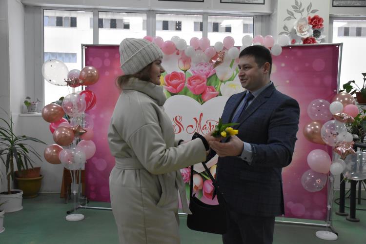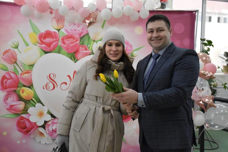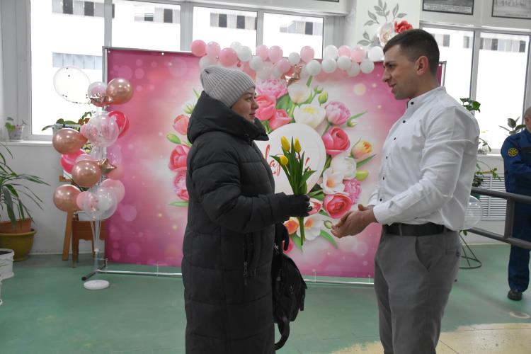 По традиции на проходной завода металлурги организовали поздравление женщин с весенним праздником. Мужчины вручили каждой заводчанке тюльпаны, звучали слова поздравлений и благодарности.