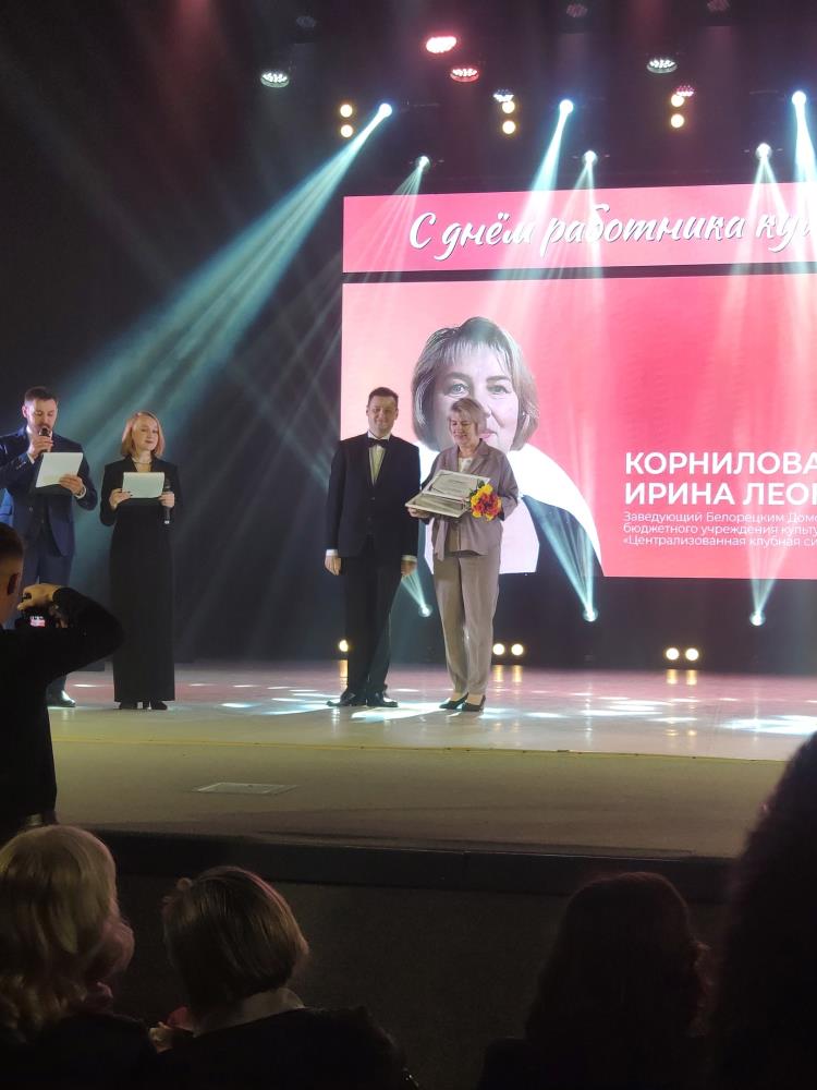 Заслуженную награду из рук министра культуры Кировской области Даниила Дворцова получил Белорецкий Дом культуры и его заведующая Ирина Корнилова, как лучшее сельское учреждение культуры и его лучший работник.