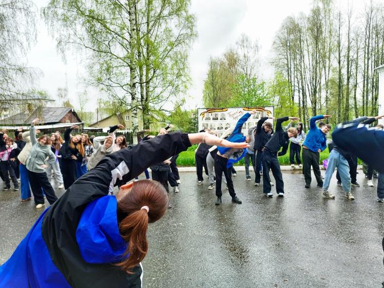 Несмотря на мелкий дождик, студенты колледжа педагогики, экономики и права провели фестиваль зарядок на территории своего учебного заведения.