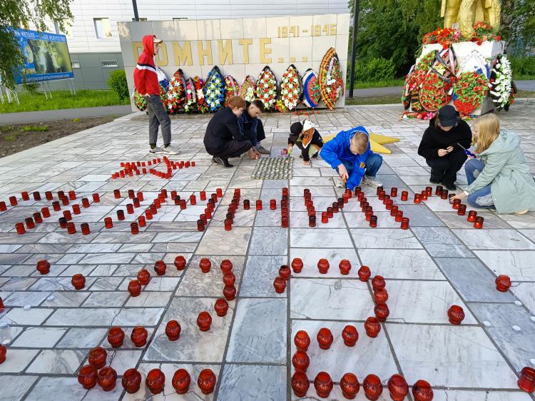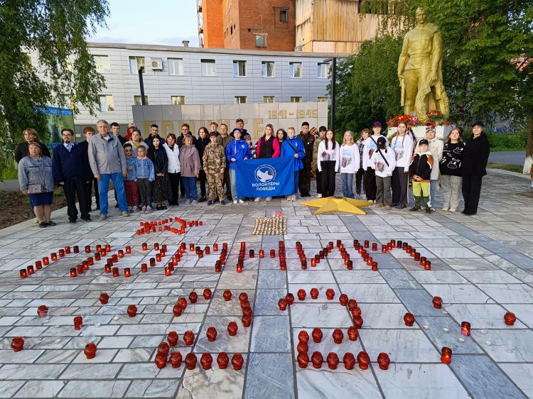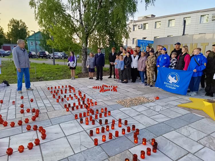 Волонтеры Победы создали огненную картину у подножия мемориала Воину-освободителю на заводской площади Омутнинска. Они использовали порядка четырехсот свечей, чтобы почтить героев.