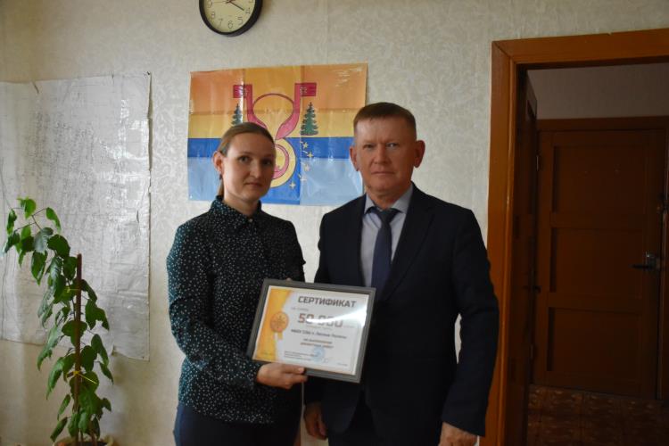 Директор школы поселка Е.В. Гостюхина рассказала о проблемах учебного учреждения: требуется ремонт помещений, обновление материально-технической базы, приобретение спортивного инвентаря. Сегодня здесь учатся сорок детей. Депутат ОЗС А.Н. Уткин вручил школе сертификат на сумму пятьдесят тысяч рублей для выполнения первоочередных ремонтных работ.